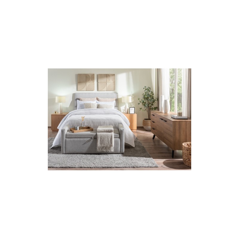 Acabado nogal tela furry beige. Fabricada en madera de pino y tela canasta.