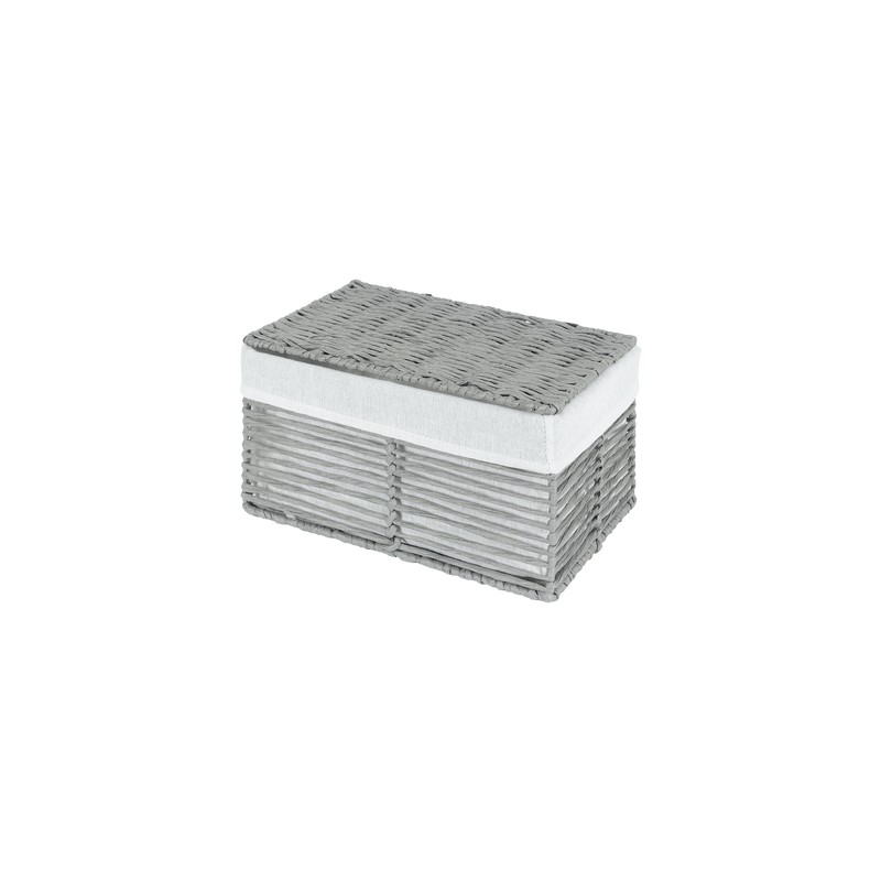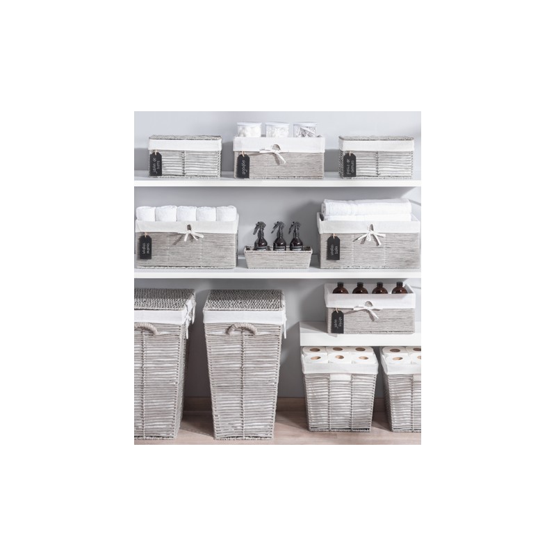 Información del producto: Canasta Tina disponible en color gris con blanco de 30 x 20 x 17 cm fabricado en cuerda de papel con una funda de 55%poliester y 45%algodón.
