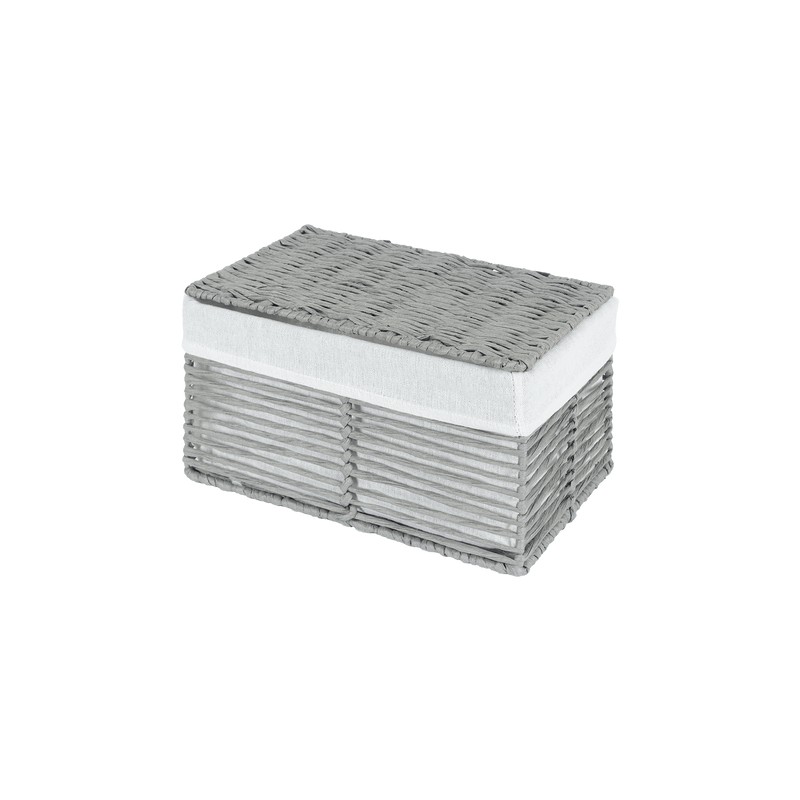 Información del producto: Canasta Tina disponible en color gris con blanco de 30 x 20 x 17 cm fabricado en cuerda de papel con una funda de 55%poliester y 45%algodón.