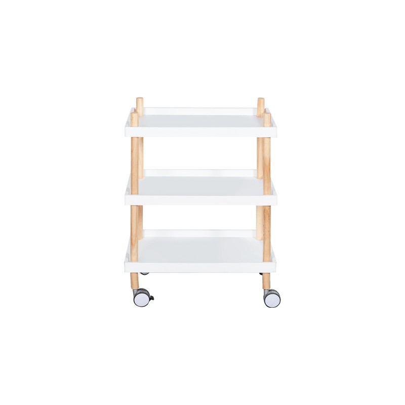 Información del producto: Carrito multiusos Logroño diseñado en un acabado blanco con natural de 48 cm de largo x 34 cm de ancho x 76.5 cm de alto, fabricado en tablero.