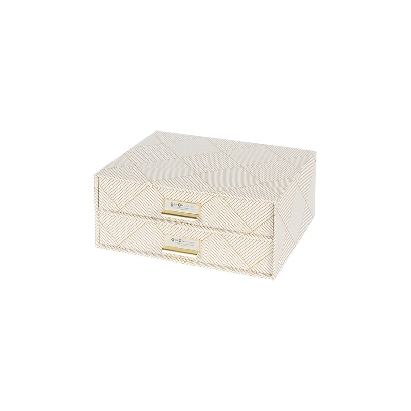 Información del producto: Cajonera dos niveles golden color dorado con blanco de 33 x 25 x 14 cm fabricado en cartón rigido.