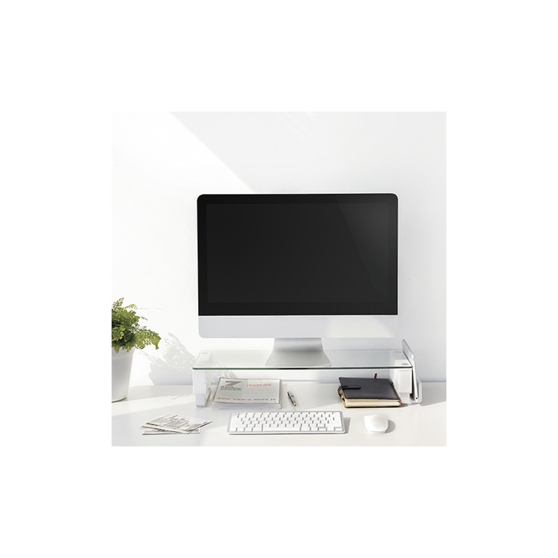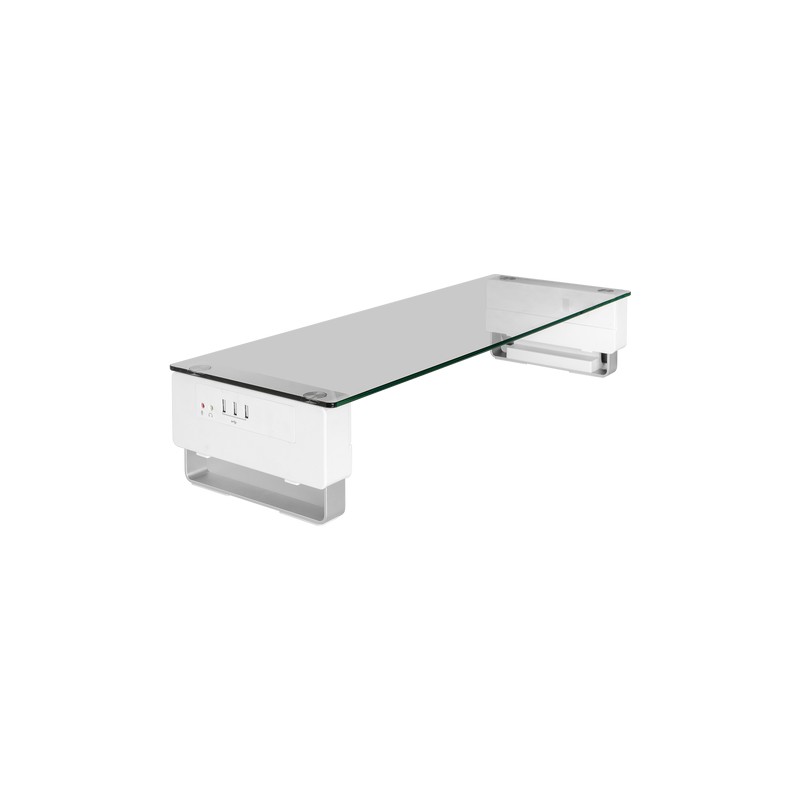 Información del producto: Soporte de monitor inteligente con una superficie de vidrio transparente.Contiene elevador de monitor ajustable, con una base de tres configuraciones de altura para ofrecer ángulos de visión agradables.Características:-Tres puertos USB 2.0, -El soporte inteligente ofrece conectores adicionales entre su computadora y dispositivos digitales. -Puerto de audio en el soporte inteligente que proporciona una opción adicional de entrada / salida.Beneficios:El diseño de sus accesorios también te ayuda a mantener ordenado el lugar de trabajo.Un administrador de cables integrado en el costado del soporte mantiene una apariencia limpia tanto del soporte del monitor como del escritorio. La ranura lateral proporciona espacio adicional para colocar iPad, Kindle, Surface Books o teléfonos móviles. Esta pequeña ranura ahorra más área en el escritorio y siempre mantiene sus dispositivos digitales a mano.Fabricada con vidrio templado de 5 mm de una medida de 61.3 x 21 x 13 cm, la superficie tiene una gran resistencia al impacto y una capacidad de carga para soportar un peso de 20 kg. Política de Envío: El tiempo de entrega es de 5 a 10 días hábiles.