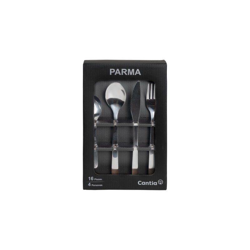 Información del producto: Juego de 16 cubiertos Parma de color plata, fabricados en acero inoxidable Política de Envío: El tiempo de entrega es de 5 a 10 días hábiles.
